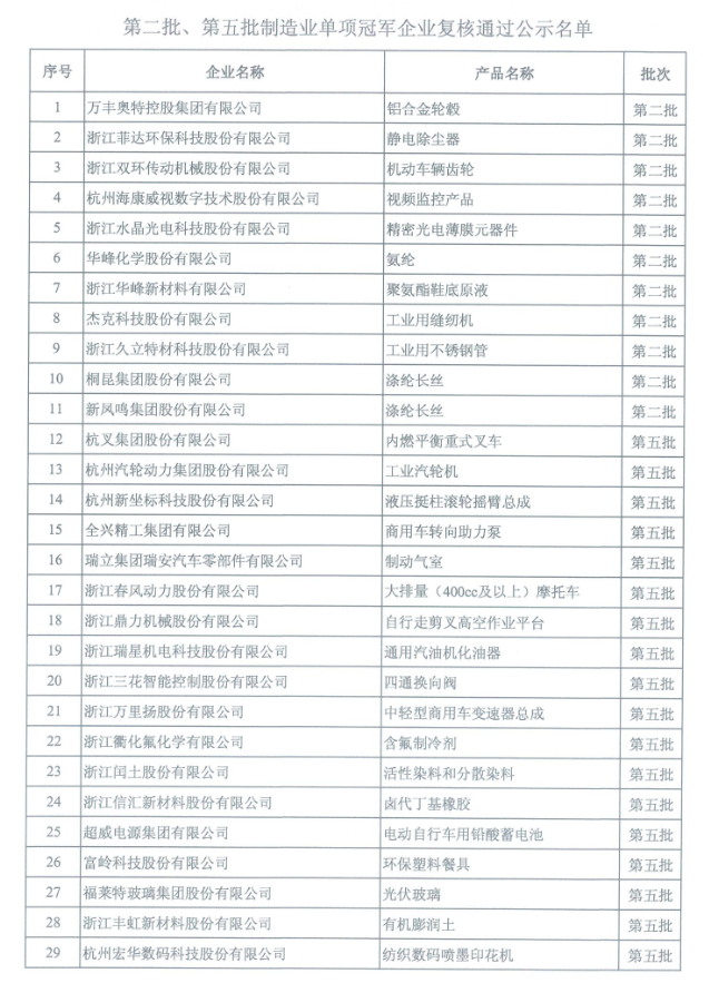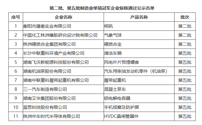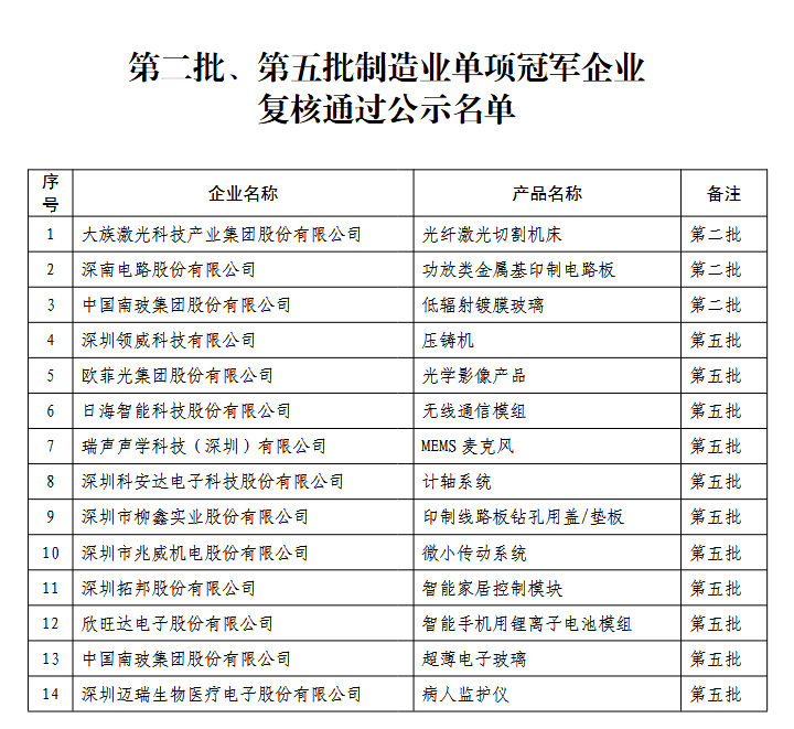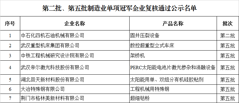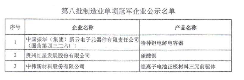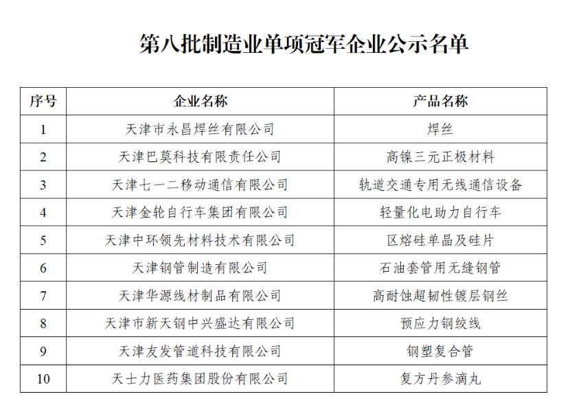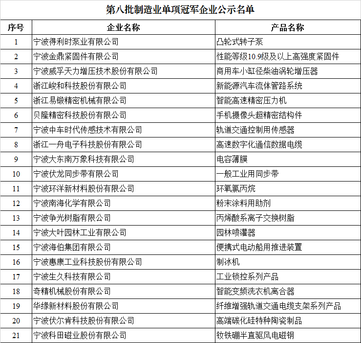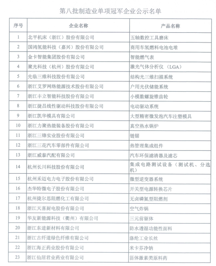 第八批制造業單項冠軍企業公示名單
