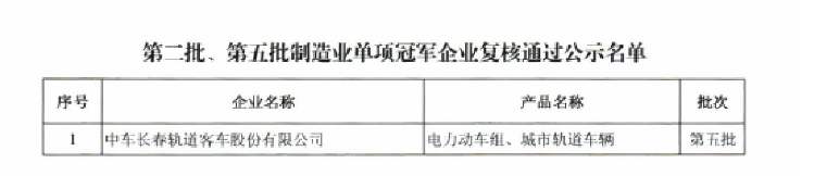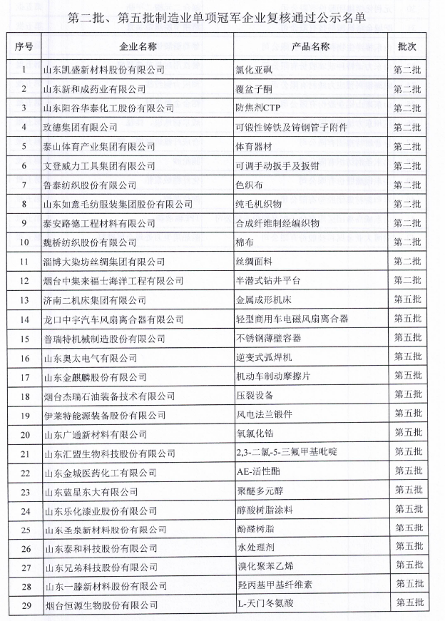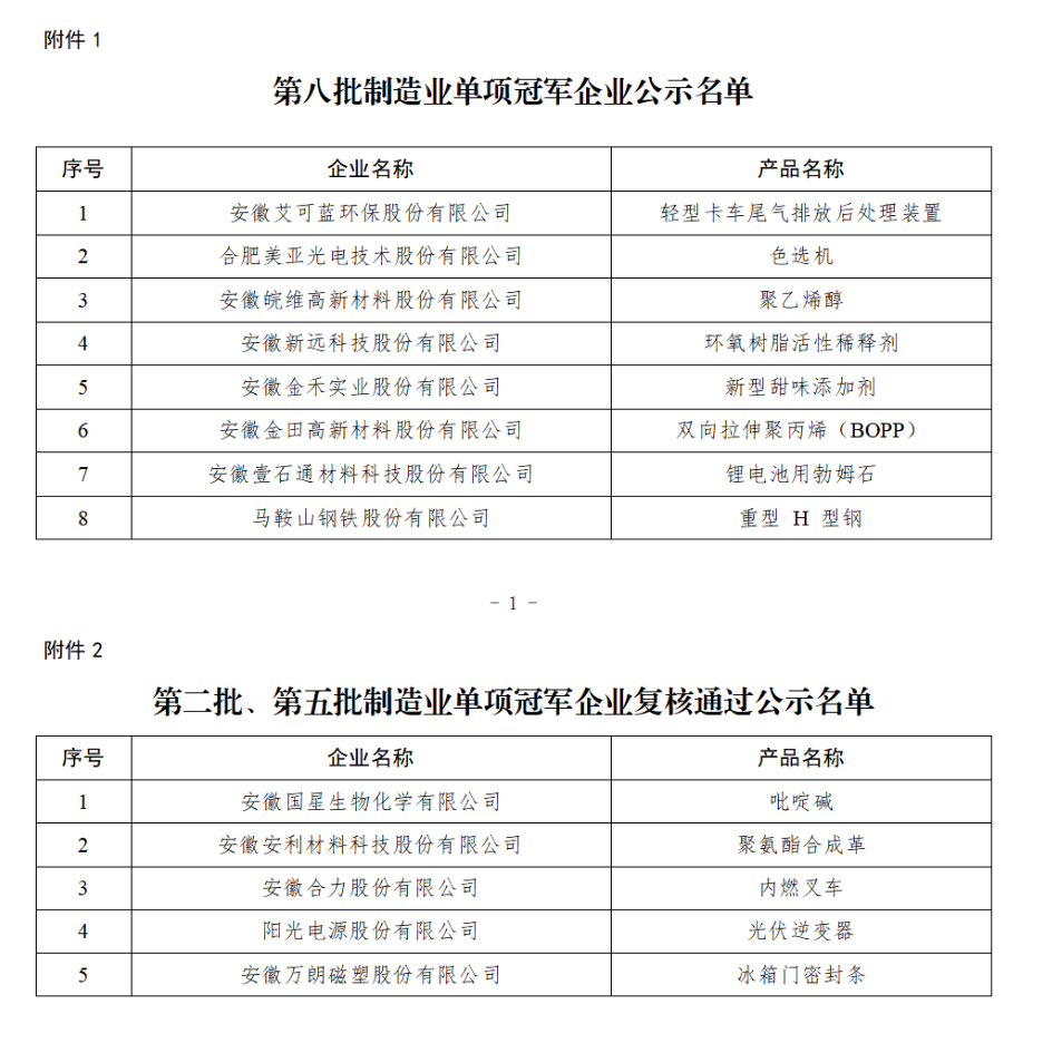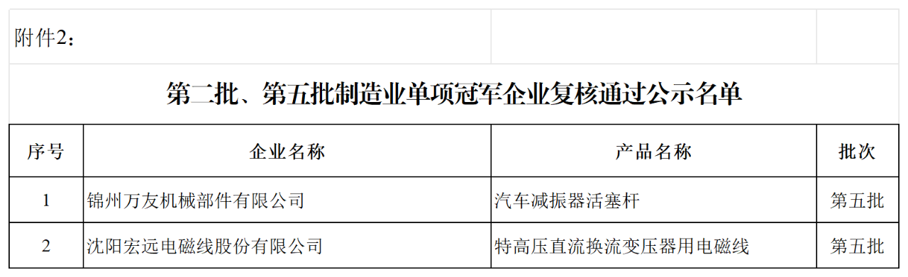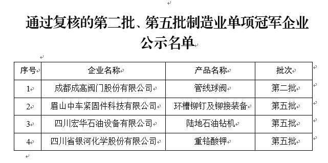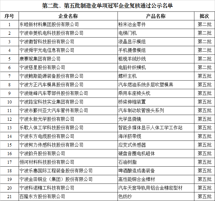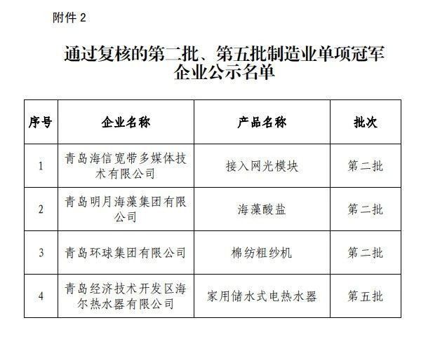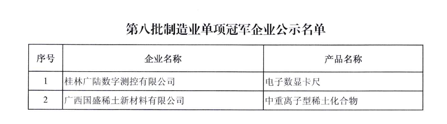 第八批制造業單項冠軍企業公示名單