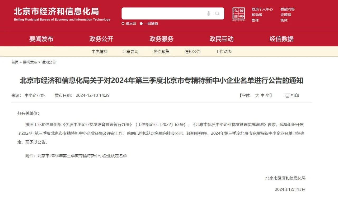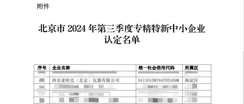 近日,北京市經濟和信息化局發布2024年度第三季度專精特新中小企業名單。西克麥哈克(北京)儀器有限公司憑借領先的技術能力,豐富的應用經驗與不懈的創新精神獲評北京市專精特新中小企業。