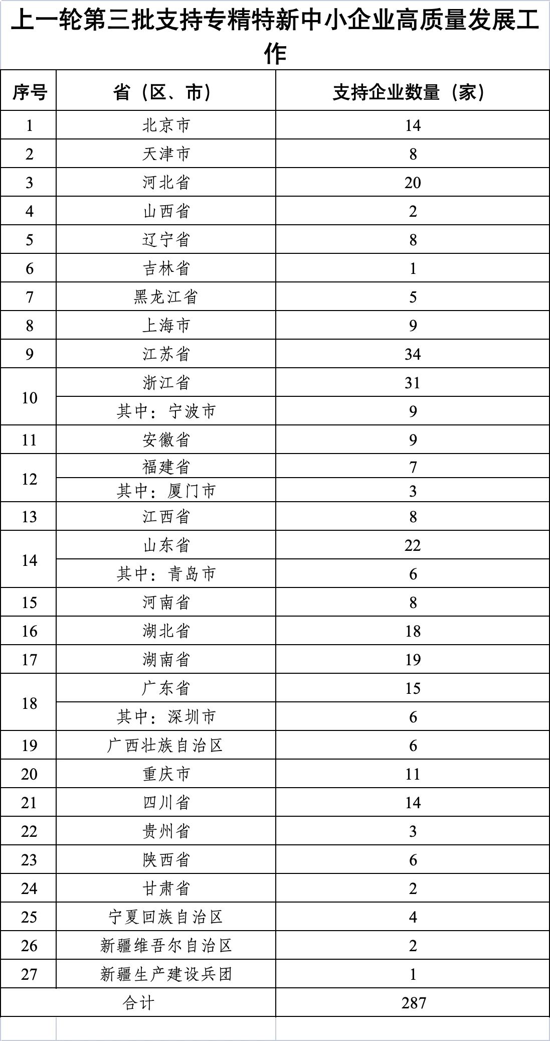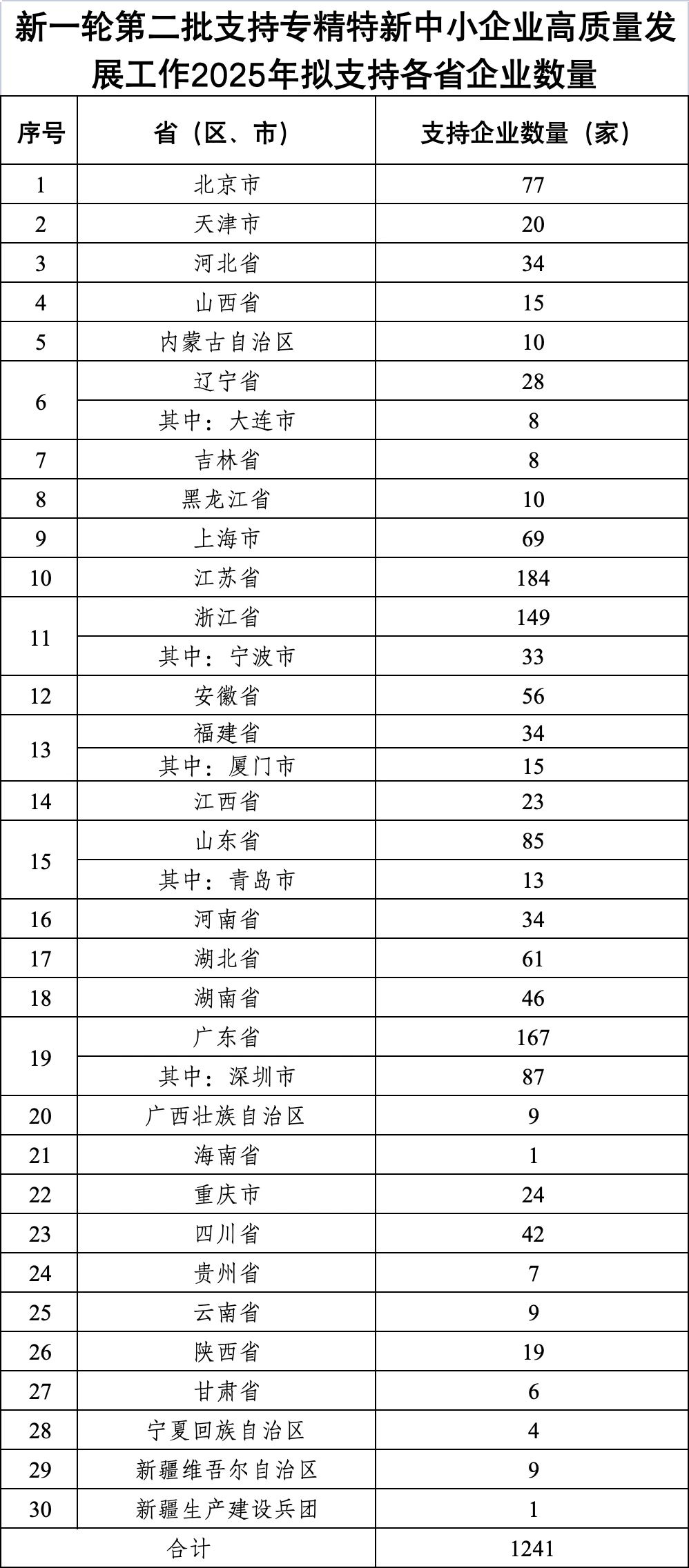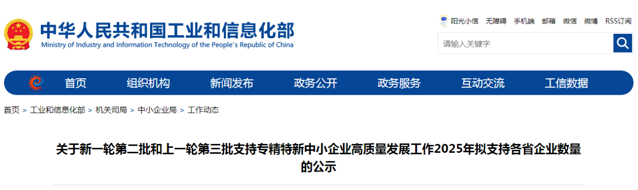 關于新一輪第二批和上一輪第三批支持專精特新中小企業高質量發展工作2025年擬支持各省企業數量的公示
