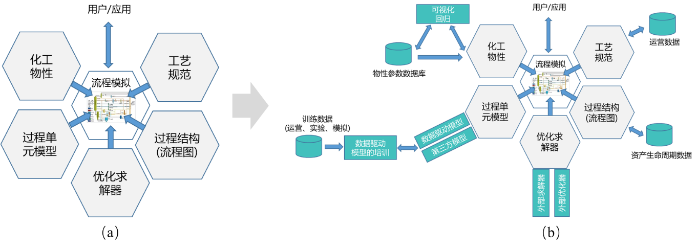化工流程模擬軟件同樣向平臺化發展。化工流程模擬軟件應用于工藝設計、虛擬開車、操作員培訓、生產優化等工廠全生命周期。經過40多年發展,領先供應商的產品已經集成穩 態模擬與動態模擬、集成煉油模擬與化工模擬,主要包括5大功能模塊,即工藝規范、過程結構(流程圖) 、優化求解器、過程單元模型和化工物性,如圖2a所示,并通過CAPE- OPEN軟件接口標準促進了通用流程模擬軟件平臺與單元模型、熱力學模型組件間的互操作。未來,化工流程模擬平臺軟件的5大模塊將進一步融合生產實時數據、實驗數據、資產生命周期數據,進一步集成第三方求解器、優化器、大數據模型、專用反應器模型、物性數據庫等,為打造石化工藝數字孿生提供平臺化支撐,如圖 2b)所示。