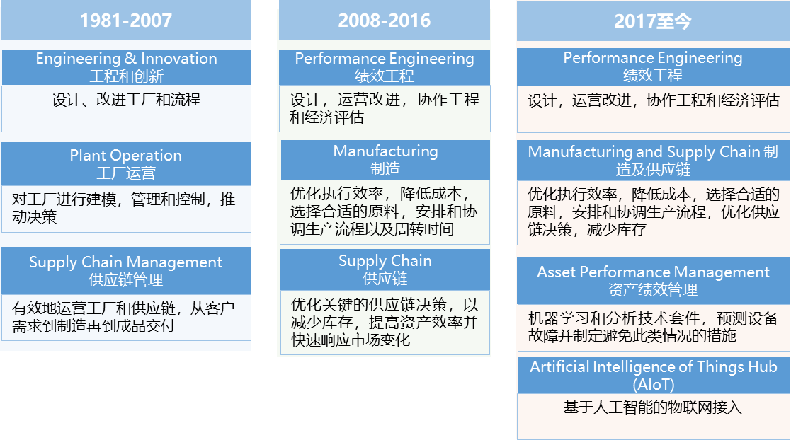 并購發展階段:從 1996 年起,艾斯本收購了超過 25 個領域中最優秀的公司,打造了涵蓋績效工程、制造與供應鏈、資產績效管理三大類軟件的產品線,廣泛應用于能源、化工、制藥、工程設計以及其他采用化學工藝生產產品的行業,如圖 3 所示。這與艾斯本從流程模擬、優化到人工智能的業務發展邏輯保持同步。202110 月,艾默生以 60 億美元現金獲得艾斯本55% 的多數股權,并將旗下 OSI 公司的電力軟件和地質建模軟件業務并入艾斯本業務中。
