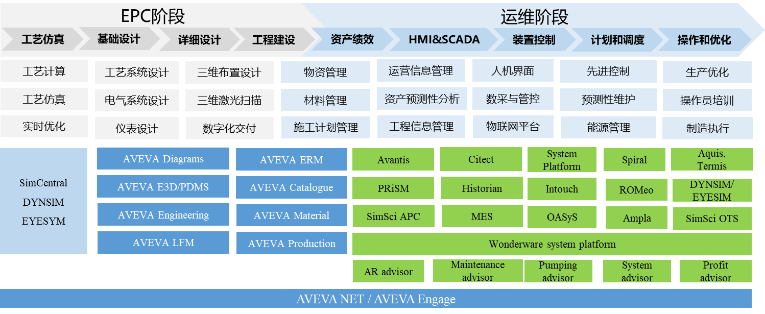施耐德于2014年收購英維斯(Invesys),2017 年反向收購劍維,并將英維斯的業務與劍維整合。原來英維斯的軟件,包括用于化工流程模擬的 PRO/II、用于換熱設備和網絡優化的HEXTRAN、用于動態過程模擬的 DYNSIM、用于在線實時優化的ROMeo等,現在都集成在劍維品牌下,形成了工程設計集成平臺AVEVA E3DIE&D、流程模擬平臺軟件、資產績效管理套件,提供從工程設計、工程建設、數字化交付到生產運營全生命周期的解決方案,如圖 4 所示。