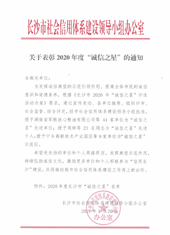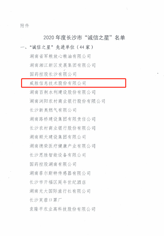 威勝信息獲評長沙市2020年"誠信之星"單位
