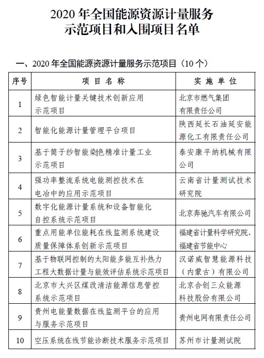 近日,根據《市場監管總局辦公廳 國家發展改革委辦公廳關于組織開展2020年度能源資源計量服務示范活動的通知》(市監計量〔2020〕94號)要求,市場監管總局辦公廳將擬入選2020年能源資源計量服務示范項目和入圍項目名單進行公示。其中,蘇州計量測試院能源計量中心的“空壓系統在線節能診斷技術服務示范項目”進入全國2020年能源資源計量服務示范項目公示目錄,全國共10個。威勝集團有限公司的“智慧能源計量技術創新示范項目”、廊坊電力傳感技術有限公司的“GSREVT 系列電阻分壓系列互感器示范項目”、蘇州市計量測試院的“基于信息化技術的重點用能單位能源計量審查和示范應用示范項目”和“基于計量的節水技術一站式服務示范項目”、力合科技( 湖南)股份有限公司的“應用信息化手段構建完善的水環境自動監測質量控制與保證體系示范項目”、金卡智能集團股份有限公司的“基于物聯網的智慧燃氣應用平臺示范項目"進入全國2020年能源資源計量服務示范入圍項目公示目錄,全國共20個。