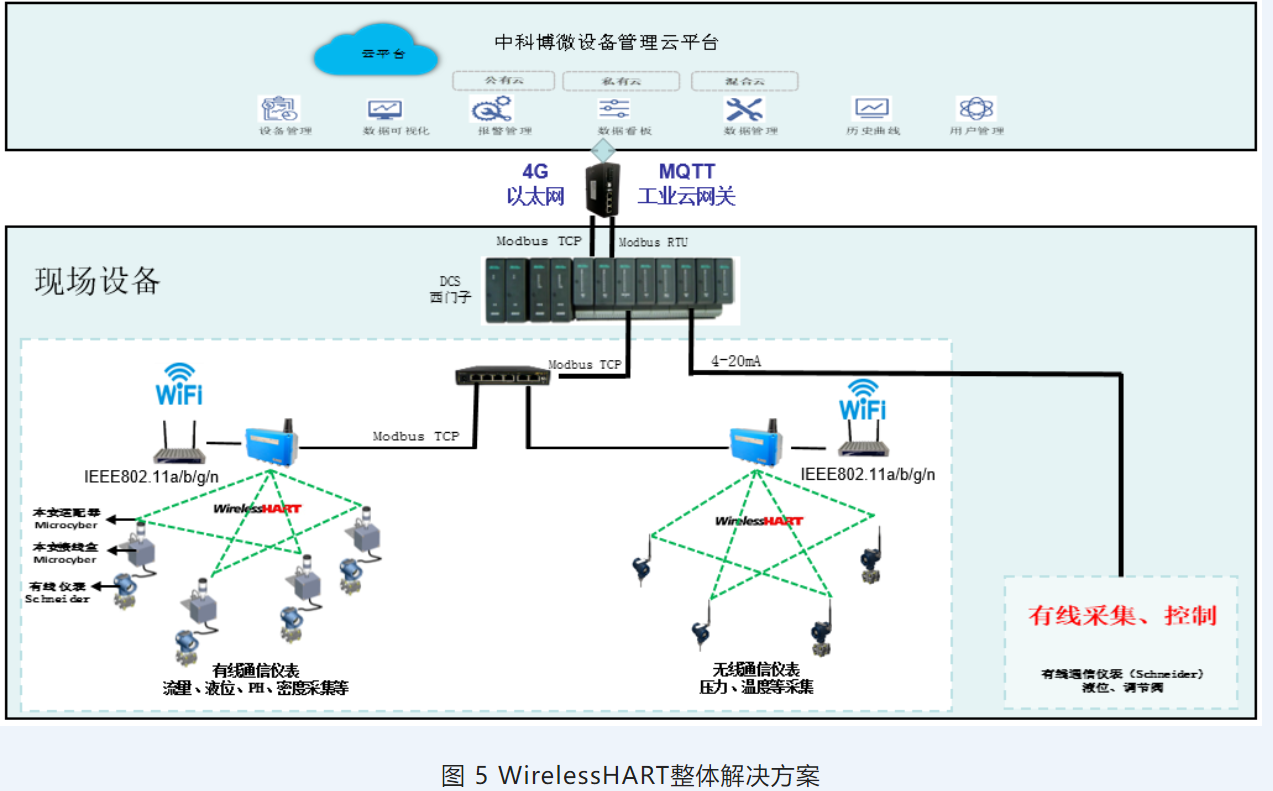 中科博微目前已經將WirelessHART國產化產品研發逐步轉移打造適應不同工況的WirelessHART產品整體解決方案階段,基于WirelessHART國產化產品,打通“上游”“下游”國產化保障渠道,開發設備管理軟件平臺,如:NCS-View、NCS-AMS等,實現多協議無線網絡深度融合及數據互聯,基于交叉融合特征的集成化創新、滲透輻射特征的跨領域創新,應對疫情環境下帶來的行業商業模式創新,實現以工業物聯網架構下的行業整體解決方案,逐步完成布局,建立并形成工業物聯網完善的生態圈建設。如圖5所示。