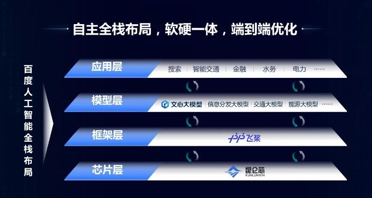 這方面百度有比較明顯的優(yōu)勢,我們在四層當(dāng)中每一層都有比較領(lǐng)先的產(chǎn)品,比如說芯片層有昆侖芯。這個也做了有十年之久,最早是因?yàn)樗阉鲬?yīng)用需要,我們買別人的芯片,畢竟太貴了,所以自己開發(fā)了。框架層是飛槳,飛槳今天在中國的市場份額第一。在模型層是文心大模型,其實(shí)除了文心一言,它是對標(biāo)ChatGPT的之外,我們還有很多行業(yè)大模型,如交通大模型、能源大模型等。應(yīng)用層的話,像百度搜索等都是我們比較領(lǐng)先的應(yīng)用。