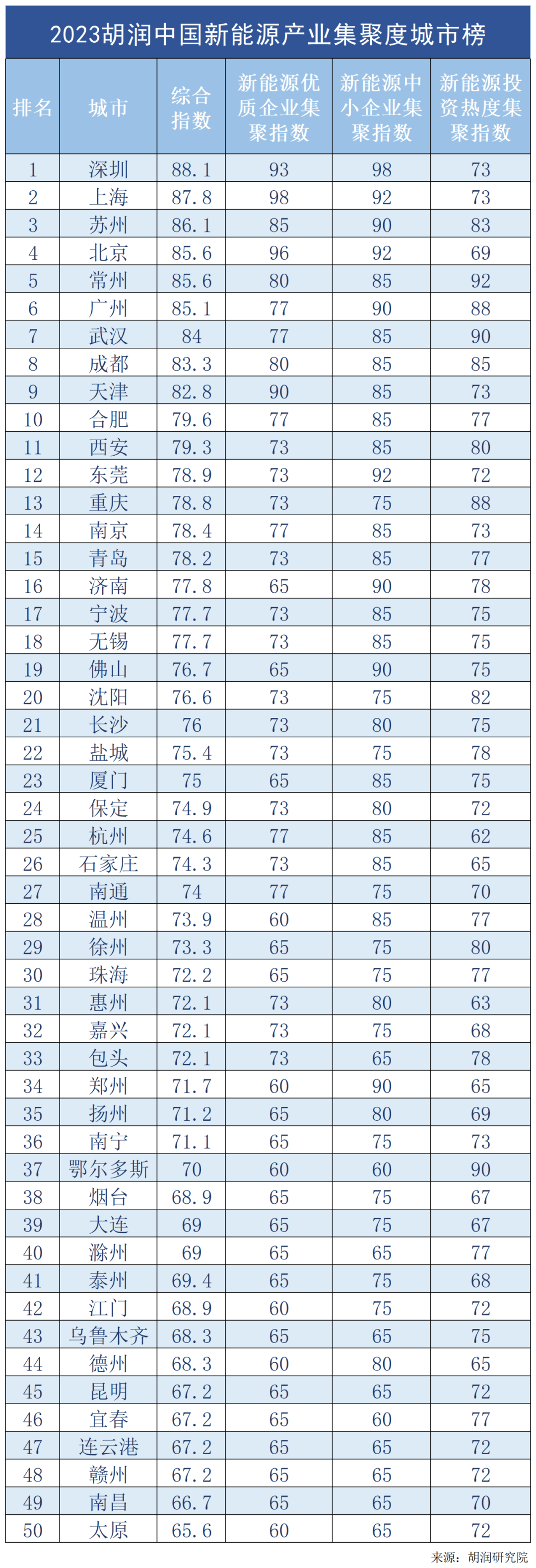 6月19日發(fā)布的《2023胡潤(rùn)中國(guó)新能源產(chǎn)業(yè)集聚度城市榜》(以下簡(jiǎn)稱榜單)顯示,深圳、上海、蘇州位列前三,北京、常州則并列第四,廣州、武漢、成都、天津和合肥分列6-10位。