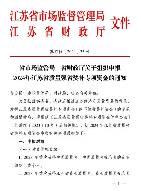江蘇省市場監(jiān)管局、江蘇省財政廳發(fā)布關(guān)于組織申報2024年江蘇省質(zhì)量強(qiáng)省獎補(bǔ)專項資金的通知,申報對象包括2023年首次通過能源管理體系認(rèn)證或節(jié)能產(chǎn)品認(rèn)證或低碳產(chǎn)品認(rèn)證或綠色產(chǎn)品認(rèn)證,且經(jīng)省市場監(jiān)管局考核評估為優(yōu)秀的企業(yè)。詳情如下: