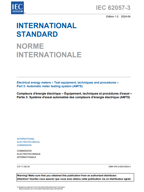 由我國主導(dǎo)制定的國際標(biāo)準(zhǔn)《IEC 62057-3電能表測試設(shè)備、技術(shù)和步驟 第3部分:電能表自動(dòng)化試驗(yàn)系統(tǒng)(AMTS)》于2024423日正式由國際電工委員會(huì)(IEC)發(fā)布,這是中國首次在電能計(jì)量領(lǐng)域主導(dǎo)制定IEC國際標(biāo)準(zhǔn)。