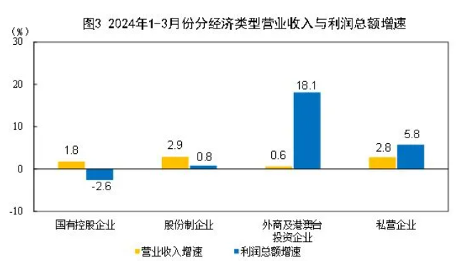 1-3月份,規(guī)模以上工業(yè)企業(yè)中,國有控股企業(yè)實(shí)現(xiàn)利潤總額5738.2億元,同比下降2.6%;股份制企業(yè)實(shí)現(xiàn)利潤總額11203.0億元,增長0.8%;外商及港澳臺(tái)投資企業(yè)實(shí)現(xiàn)利潤總額3737.5億元,增長18.1%;私營企業(yè)實(shí)現(xiàn)利潤總額3679.7億元,增長5.8%