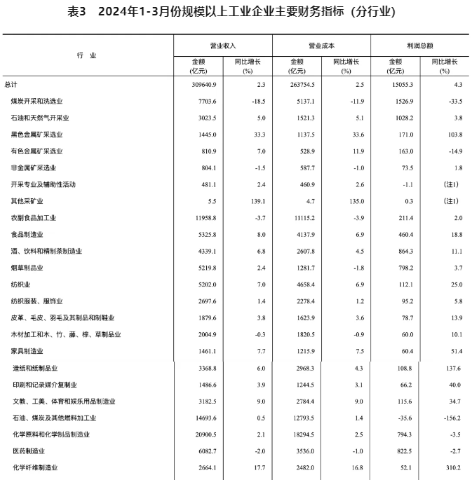 20241-3月份,全國規(guī)模以上工業(yè)企業(yè)實(shí)現(xiàn)利潤總額15055.3億元,同比增長4.3%(按可比口徑計(jì)算)。