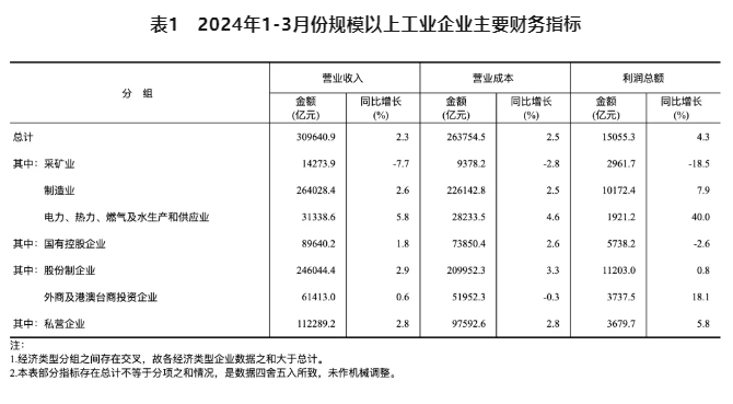 1-3月份,規(guī)模以上工業(yè)企業(yè)實(shí)現(xiàn)營業(yè)收入30.96萬億元,同比增長2.3%;發(fā)生營業(yè)成本26.38萬億元,增長2.5%;營業(yè)收入利潤率為4.86%,同比提高0.09個(gè)百分點(diǎn)。