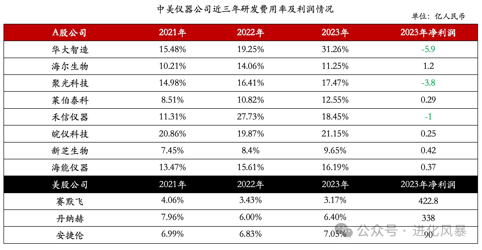 為了解決技術遷移難的問題,我們觀察到很多儀器公司在上市/融資后利用募集資金開始大量擴充產品品類,廣招研發人員,廣開研發管線,以至于研發費用飆升,給公司經營業績(凈利潤和現金流)造成沉重的負擔。而同期海外巨頭的研發費用率持續保持在10%以內,賽默飛甚至將研發費用率控制在5%以下(刨除服務、經銷類產品后,約810%)。
