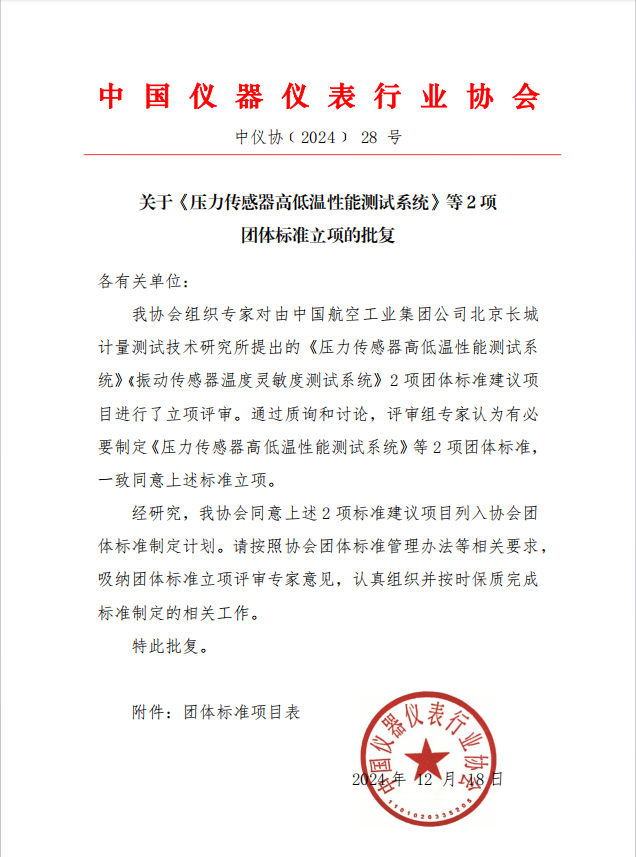 根據(jù)《中國儀器儀表行業(yè)協(xié)會(huì)團(tuán)體標(biāo)準(zhǔn)管理辦法》的規(guī)定,經(jīng)審查,對(duì)由中國航空工業(yè)集團(tuán)公司北京長(zhǎng)城計(jì)量測(cè)試技術(shù)研究所(簡(jiǎn)稱“304)提出的《壓力傳感器高低溫性能測(cè)試系統(tǒng)》 《振動(dòng)傳感器高低溫性能測(cè)試系統(tǒng)》2項(xiàng)團(tuán)體標(biāo)準(zhǔn)進(jìn)行立項(xiàng)(標(biāo)準(zhǔn)編號(hào)和標(biāo)準(zhǔn)名稱見公告附件),特此公告。
