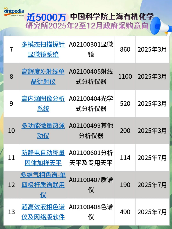 中國科學院上海有機化學研究所2025年2至12月政府采購意向發(fā)布,預算金額4895萬,采購項目13個。