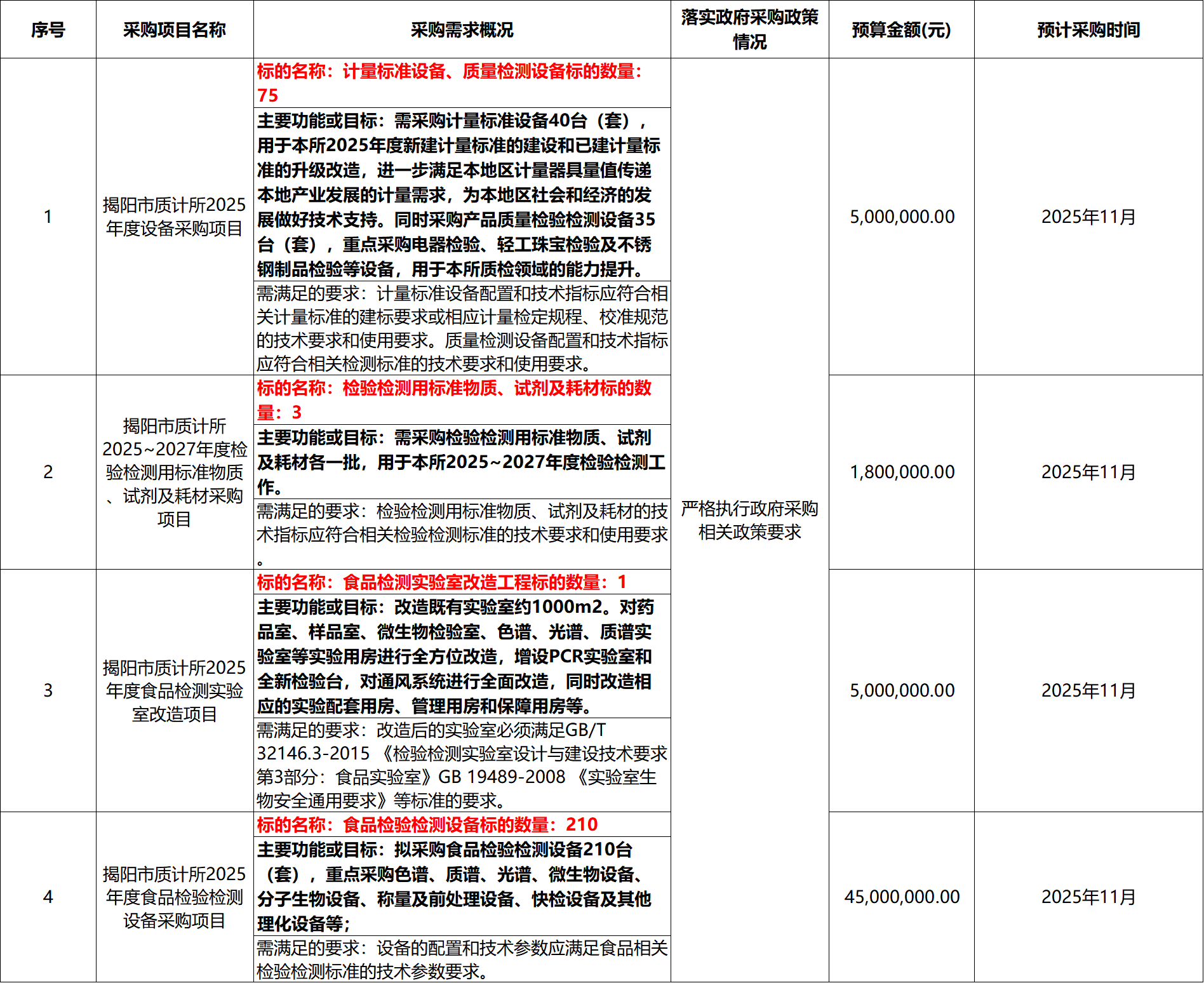 4 月 22 日,廣東省揭陽市質(zhì)量計量監(jiān)督檢測所就 2025 年 04 月至 2025 年 11 月政府采購意向連續(xù)發(fā)布 4 個公告。公告顯示,在 11 月份,揭陽質(zhì)量計量監(jiān)督所將著重采購色譜、質(zhì)譜、光譜、微生物設(shè)備、分子生物設(shè)備、稱量及前處理設(shè)備、快檢設(shè)備及其他理化設(shè)備等 210 臺儀器用于食品檢驗檢測;采購相關(guān)檢驗檢測用標(biāo)準(zhǔn)物質(zhì)、試劑及耗材 3 批;采購計量標(biāo)準(zhǔn)設(shè)備 40 臺(套);采購產(chǎn)品質(zhì)量檢驗檢測設(shè)備 35 臺(套)。