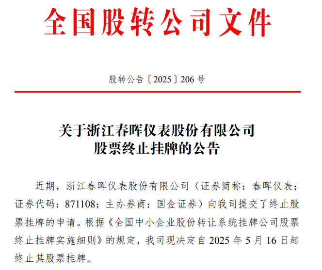 2025 年 5 月 13 日,全國中小企業(yè)股份轉(zhuǎn)讓系統(tǒng)有限責(zé)任公司發(fā)布股轉(zhuǎn)公告〔2025〕206 號,宣布浙江春暉儀表股份有限公司(證券簡稱:春暉儀表)向其提交了終止股票掛牌的申請。依據(jù)《全國中小企業(yè)股份轉(zhuǎn)讓系統(tǒng)掛牌公司股票終止掛牌實(shí)施細(xì)則》規(guī)定,全國股轉(zhuǎn)公司決定自 2025 年 5 月 16 日起終止春暉儀表股票掛牌。