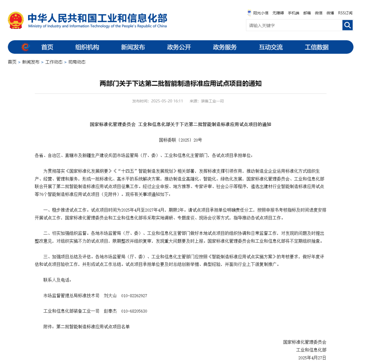 經過企業申報、地方推薦、專家評審、社會公示等程序,國家標準化管理委員會、工業和信息化部近日下達第二批智能制造標準應用試點項目名單,中核控制系統工程有限公司的“核設施DCS裝備智能制造標準應用試點”,浙江萬勝智能科技股份有限公司的“智能配用電智能工廠標準應用試點”,福建順昌虹潤精密儀器有限公司的“面向智能儀表生產的智能工廠標準應用試點”,三川智慧科技股份有限公司的“智能水表智能工廠建設標準應用試點”等76個智能制造標準應用試點項目進入名單。試點項目時間為2025年4月至2027年4月,期限2年。