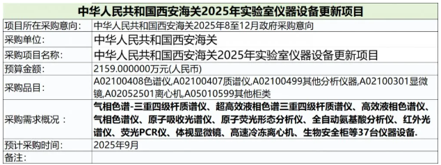 2159萬元,西安海關2025年實驗室儀器設備更新