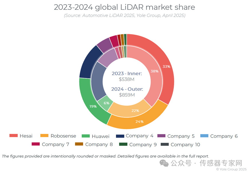 據(jù)今年4月份,咨詢機(jī)構(gòu)Yole Group發(fā)布最新全球激光雷達(dá)產(chǎn)業(yè)報(bào)告《Automotive LiDAR 2025 》(2025車載激光雷達(dá)報(bào)告)數(shù)據(jù)顯示,中國(guó)激光雷達(dá)廠商禾賽科技占據(jù)33%的市場(chǎng)份額,其次是速騰聚創(chuàng)(24%)、華為(19%)和圖達(dá)通。這四家中國(guó)廠商占據(jù)了88%的市場(chǎng)份額。