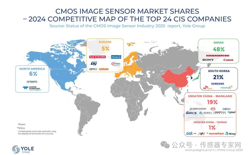 根據(jù)Yole Status of the CMOS Image Sensor Industry 2025》(《2025 CMOS 圖像傳感器行業(yè)現(xiàn)狀》)報(bào)告顯示,以豪威集團(tuán)(原韋爾股份、Omnivision)、格科微(Galaxycore)、思特威(Smartsens)、比亞迪(BYD)、長(zhǎng)光辰芯(Gpixel)、匯頂科技(Goodix)、銳芯微為代表的中國(guó)大陸CMOS圖像傳感器產(chǎn)生,占據(jù)全球19%的市場(chǎng)份額。此外,中國(guó)臺(tái)灣省的原相科技、晶相科技、敦泰科技等廠商,合計(jì)占1%市場(chǎng)份額。