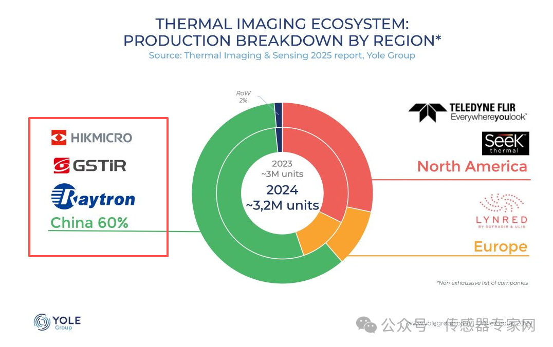 根據(jù)Yole 8月份剛剛發(fā)布的最新《Thermal Imaging and Sensing 2025》(《熱成像與傳感2025》)報(bào)告顯示,以海康微影(Hikmicro)、高德紅外(Gstir)、睿創(chuàng)微納(Raytron)為代表的中國(guó)紅外傳感公司,占據(jù)全球60%的市場(chǎng)份額。
