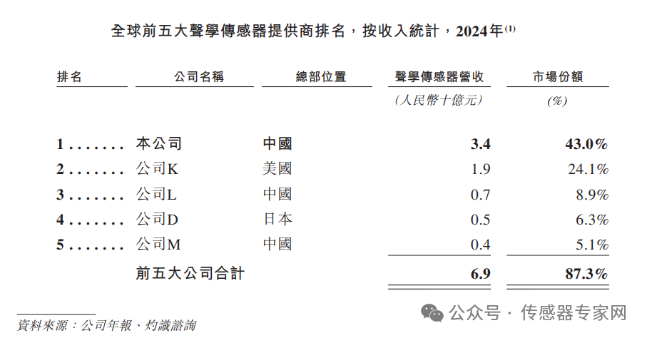 MEMS聲學(xué)傳感器:中國(guó)廠商合計(jì)占全球57%,最高企業(yè)排名第 1