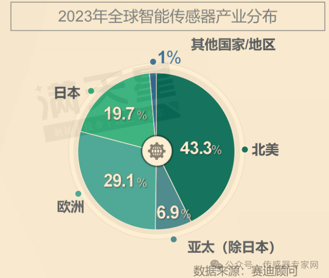 然而,在高精尖的智能傳感器市場(chǎng),2023年全球智能傳感器產(chǎn)業(yè)由北美、歐洲、日本主導(dǎo),其中,北美占比最高,達(dá)43.3%,歐洲占比29.1%,日本占比19.7%,亞太地區(qū)(除日本)占比6.9%,其他國(guó)家/地區(qū)占比1%