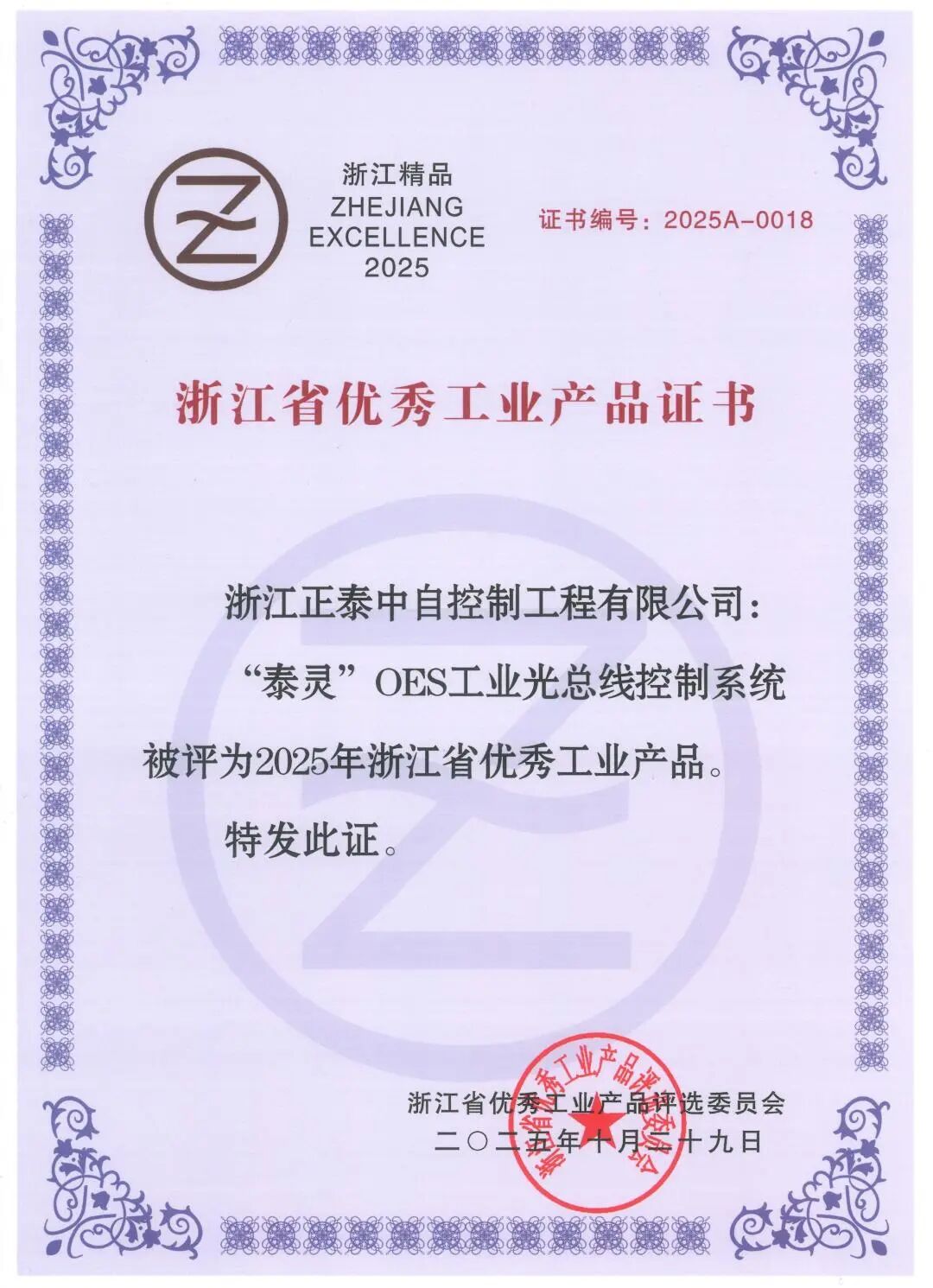 正泰中自“泰靈”OES工業光總線控制系統獲“202