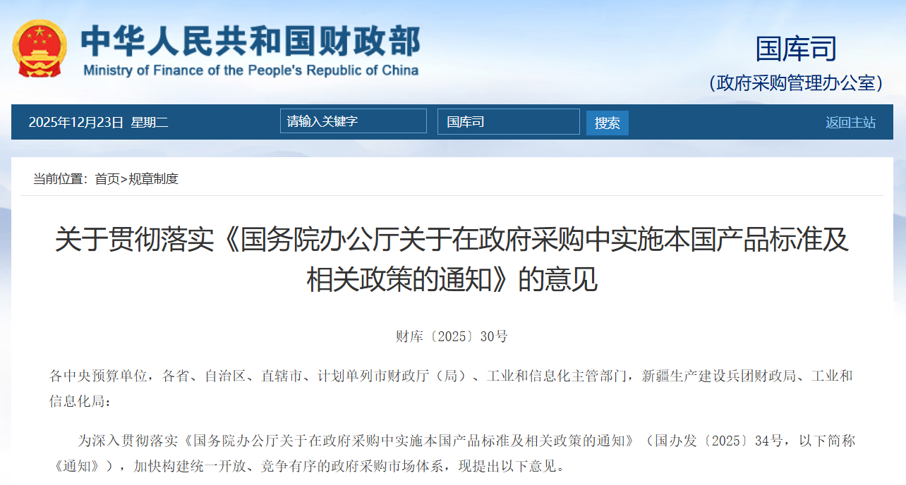 為深入貫徹落實《國務院辦公廳關于在政府采購中實施本國產品標準及相關政策的通知》(國辦發〔202534號,以下簡稱《通知》),加快構建統一開放、競爭有序的政府采購市場體系,現提出以下意見。