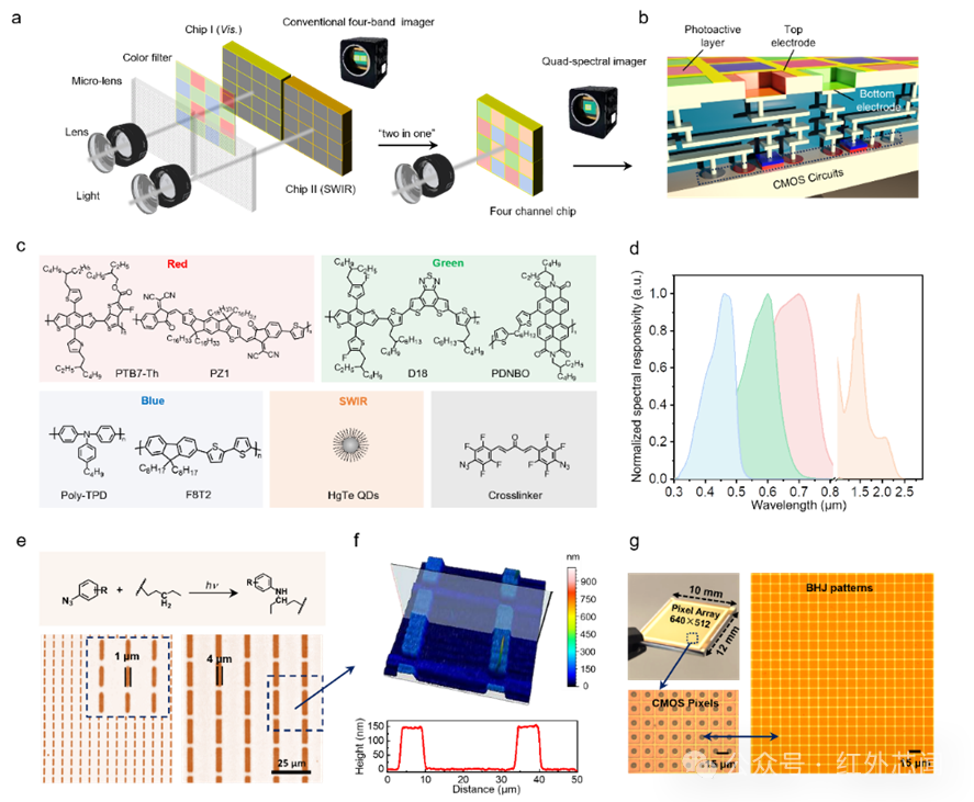 所提出的直接光圖案化方法與標準CMOS制造工藝完全兼容。研究人員將基于聚合物的三色可見光像素與基于碲化汞量子點的短波紅外像素單片集成到同一讀出電路上。這種混合集成策略使得四通道成像器件得以實現,其中可見光和短波紅外像素以2×2陣列排列,每個子陣列的有效分辨率為320×256