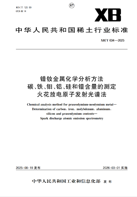 由鋼研納克檢測技術股份有限公司(以下簡稱“鋼研納克”)牽頭,鋼研納克江蘇檢測技術研究院有限公司參與,聯合多家行業重點稀土金屬生產企業共同起草的稀土行業標準《XB/T 634-2025 鐠釹金屬化學分析方法 碳、鐵、鉬、鋁、硅和鐠含量的測定 火花放電原子發射光譜法》已于2025年8月19日發布,于2026年3月1日起正式實施。作為稀土行業首個采用火花光譜分析方法的標準,它進一步完善了鐠釹金屬化學成分檢測方法體系,也體現了鋼研納克及鋼研納克江蘇檢測技術研究院有限公司在稀土檢測技術研發與標準化建設方面的持續積累。